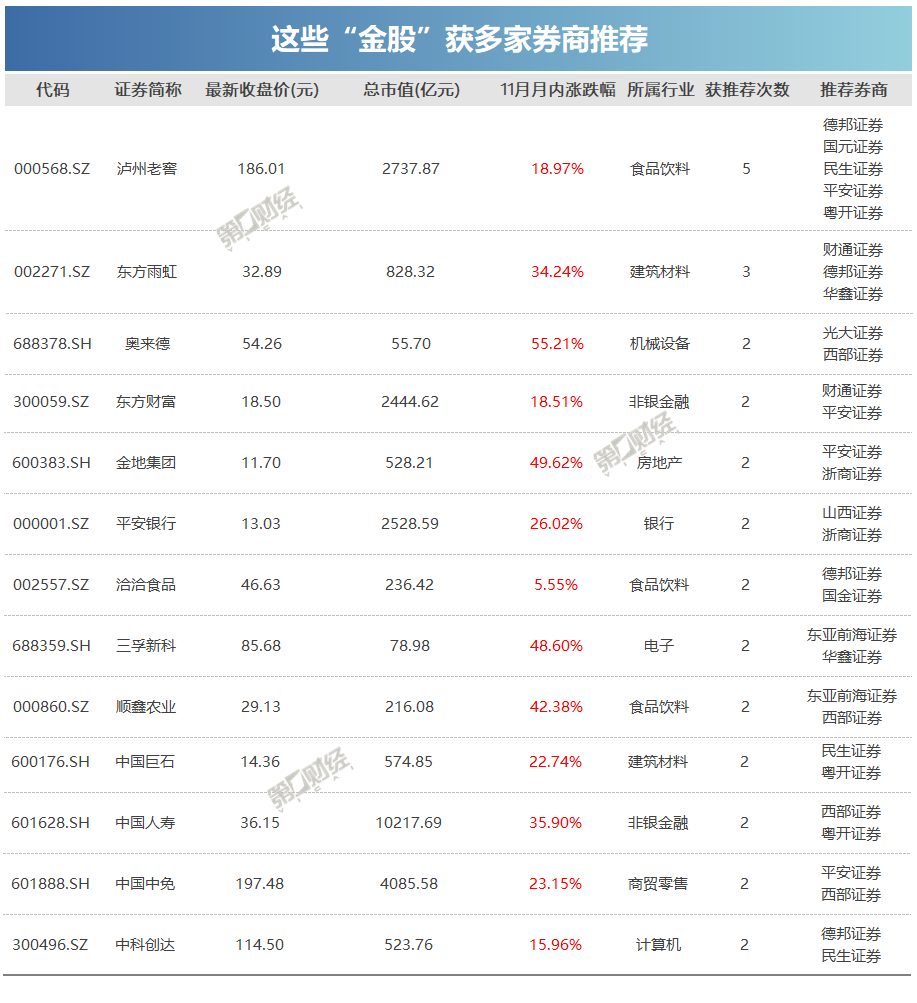 此外,东方雨虹、奥来德、东方财富等12只个股均获得2家以上券商的推荐。