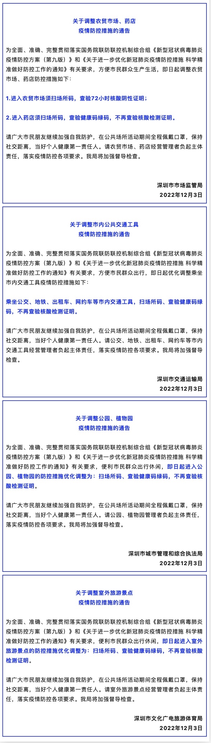 据深圳发布,深圳市市场监管局、深圳市交通运输局等四部门发布通报,调整乘坐市内公共交通工具、药店等疫情防控措施。即日起,乘坐公交、地铁、出租车、网约车等市内交通工具,进入药店、公园、旅游景点等,扫场所码、查验健康码绿码,不再查验核酸检测证明。
