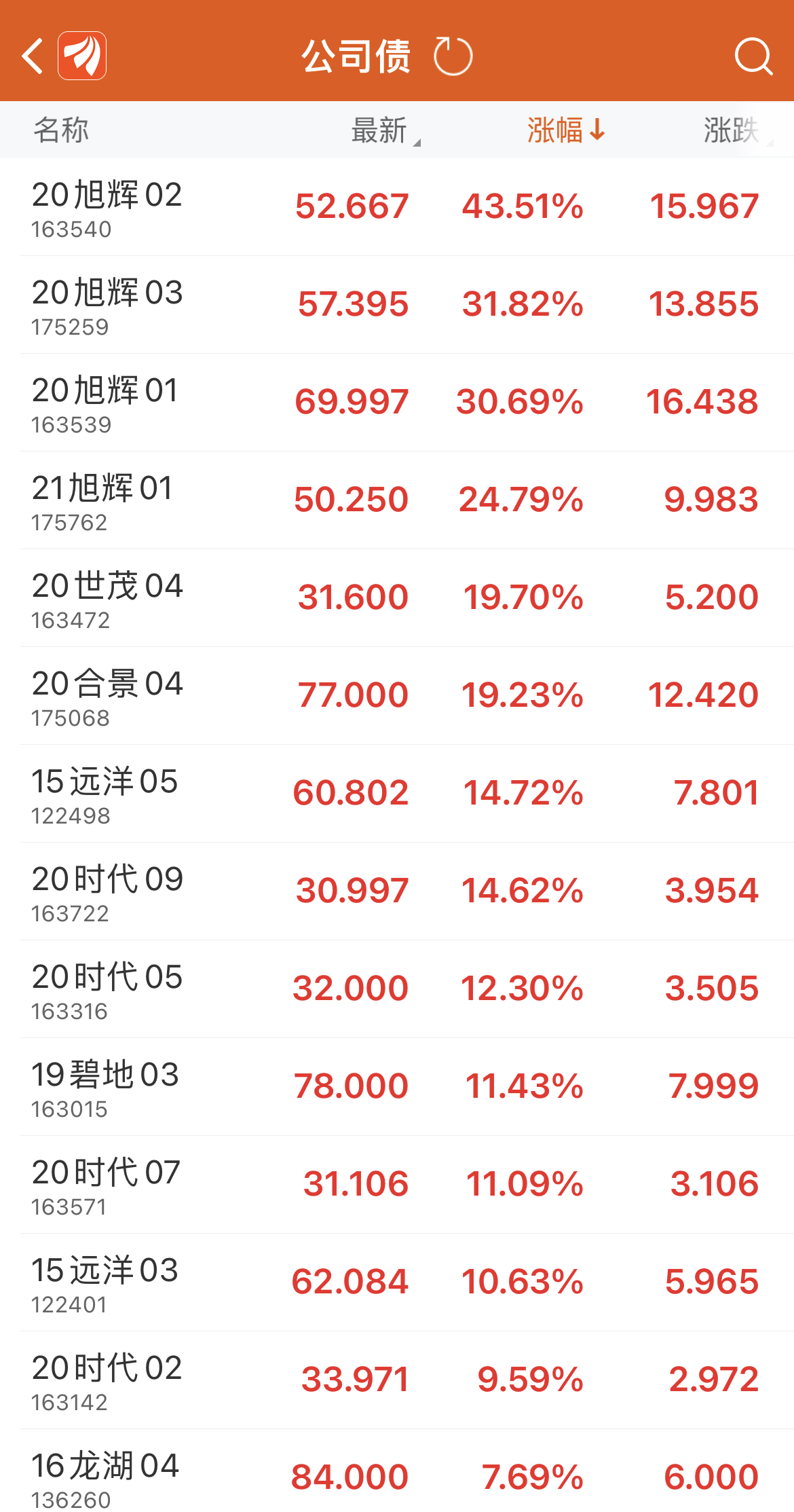 截至12月5日收盘,旭辉旗下多只创下超高涨幅,“20旭辉02”涨超43%,“20旭辉03”、 “20旭辉01”涨幅超30%,“21旭辉01”涨超24%。此外,金科、龙湖、世茂、合景泰富、远洋等旗下的公司债亦有大幅上涨。