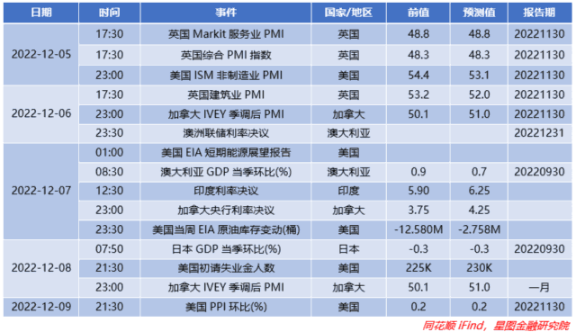 美国方面,美国商务部11月30日公布的修正数据显示,今年第三季度美国国内生产总值(GDP)按年率计算增长2.9%,较10月底发布的初次数据上调0.3个百分点。当日美联储主席鲍威尔证实,该行或将在12月放慢加息步伐。他解释称,现在的央行利率已接近抑制水平,足以使美国通胀率持续下降,这个时候放慢加息是有意义的。此外由于需求疲软,11月美国商业活动连续第五个月收缩,11月标准普尔全球综合采购经理人指数估值下滑至46.3,表明商业活动收缩。美国11月ADP就业人数增加12.7万人,为2021年1月以来的最低水平。美国10月核心PCE物价指数环比升0.2%,同比升5.0%;10月PCE物价指数环比升0.3%,同比升6.0%,低于前值和预期。