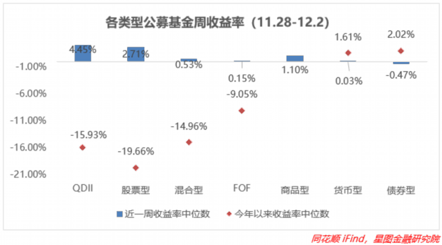 上周QDII型基金收益率中枢最高,在外围带动下收益进一步放大,年内收益同样有所大幅回暖,环比+3.45pct;股票型、混合型基金受股票走势影响跟涨,分别上涨1.70%、0.54%;债券型基金周/年收益率中枢环比均有所改善,是所有基金中唯一的类型,但在周内依旧领跌所有基金;其余类型基金跌幅都在0%到0.4%之间;货币型基金继续积累收益。