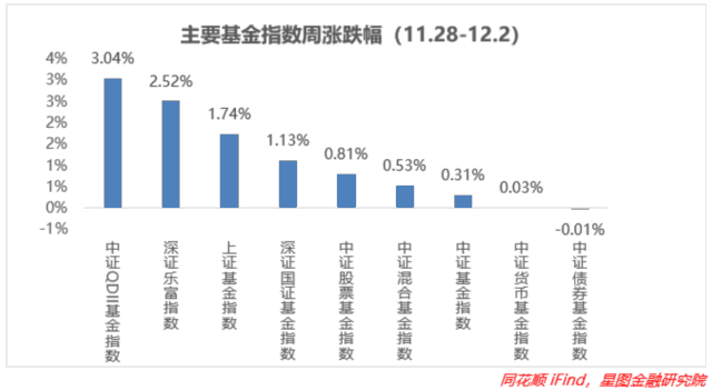 上周各大基金指数除债基外全面收涨,由于美联储加息出现放缓,所以美股、H股涨势较好,其中恒指、恒生科技周内涨幅分别超过6%、10%,所以QDII基金领涨,涨超3%;国内A股表现也比较好,尤其是深证成指和创业板指,所以深系相关基金指数涨幅紧随其后,超过2.5%;上系指数表现一般,所以相关指数周涨幅在0.5%上下;周内债基指数跌幅进一步收窄,仅跌0.01%;货基变化不大。