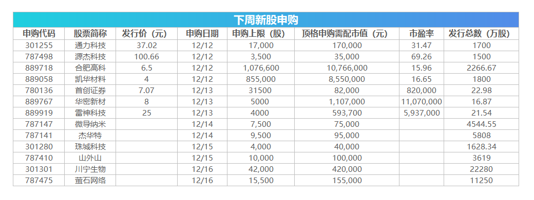 目前已披露信息显示,下周将有13只新股发行,其中创业板有3只。12月12日发行的是凯华材料、源杰科技、合肥高科、通力科技;12月13日发行的是雷神科技、华密新材、首创证券;12月14日发行的是微导纳米、杰华特;12月15日发行的是山外山、珠城科技;12月16日发行的是萤石网络、川宁生物。