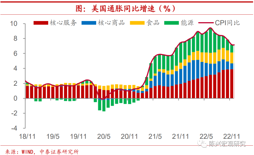 11月美国CPI同比增速录得7.1%,较上月大幅回落,远超市场预期。环比增速录得0.1%,较上月有所下行。11月核心CPI同比增速较上月下行0.3个百分点,录得6.0%;环比增速较上月回落,录得0.2%。本月通胀回落再超预期,核心服务贡献较上月保持不变,核心商品与能源项是CPI回落的最大贡献。此前我们在报告中不断重申,四季度通胀回落或有加快。展望未来,我们坚持此前观点,预计房租或将于近月见顶回落,考虑到衰退对需求的影响逐步兑现,劳动力市场持续降温,叠加高基数效应,未来CPI仍将快速回落。