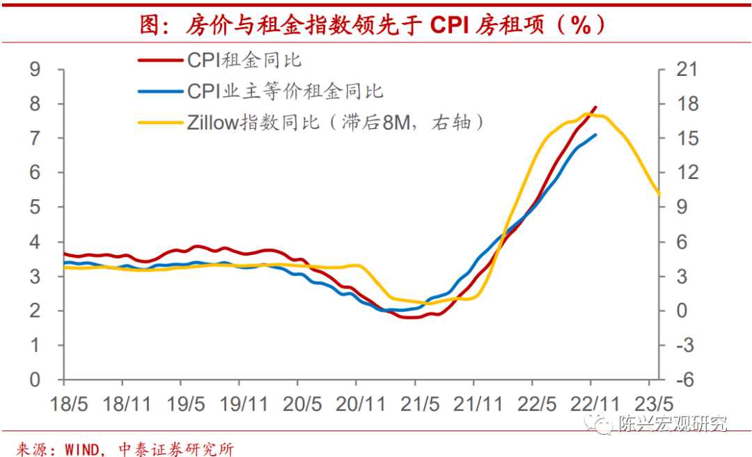11月核心服务录得6.8%,较上月上行0.1个百分点。环比增速为0.4%,较10月下行0.1个百分点。从核心服务的主要分项来看,租金和业主等价租金同比增速均继续走高;环比较上月有所上行,预计房租可能于近月见顶回落。除住房外,医疗服务同比增速较上月下行1.1个百分点,环比增速也录得负值;交通服务项同比增速下行1个百分点,环比增速也有回落。