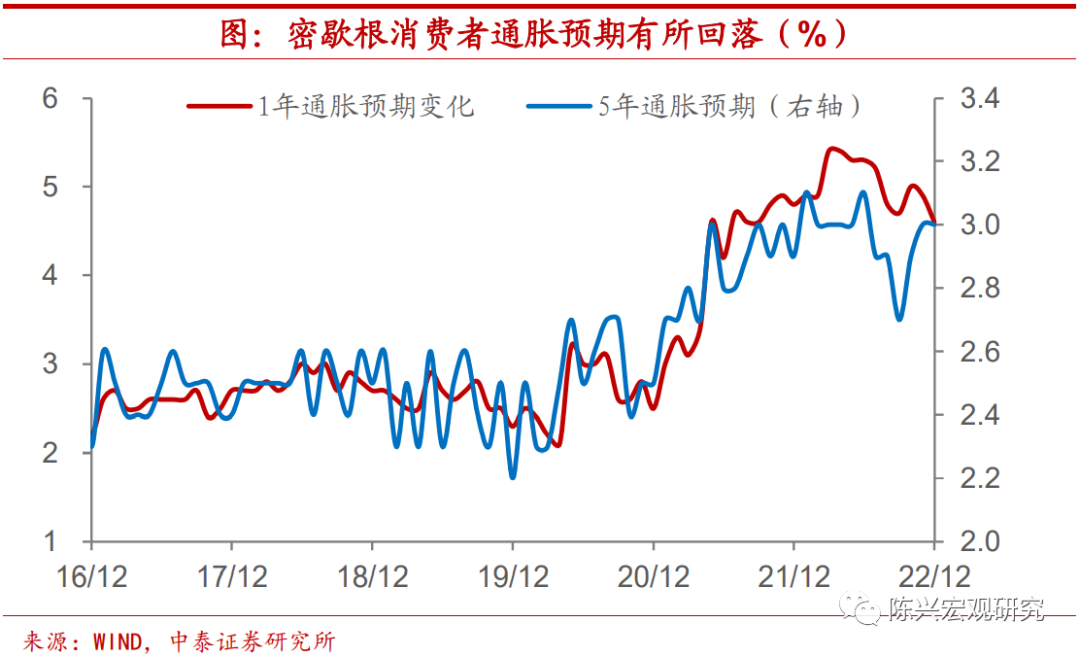 密歇根消费者预期数据显示,消费者一年期通胀预期有所回落,12月通胀预期较上月下行0.3个百分点录得4.6%,而5年期通胀预期较上月保持稳定。