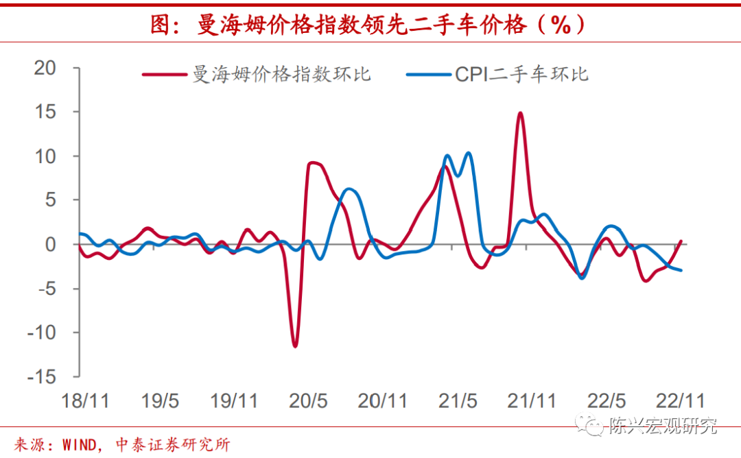 11月CPI核心商品项同比和环比增速较上月均有所下行,分别录得3.7%和-0.5%。从主要分项来看,11月新车和二手车价格同比增速均有所下行,且相较10月均有提速,分别录得7.2%和-3.3%。环比来看,新车增速降至0%,而二手车录得-2.9%。虽然领先指标曼海姆价格指数环比在11月小幅回升0.4%,但从今年2月开始的下行趋势并未消减,未来二手车价格仍将继续回落,带动核心商品继续走低。