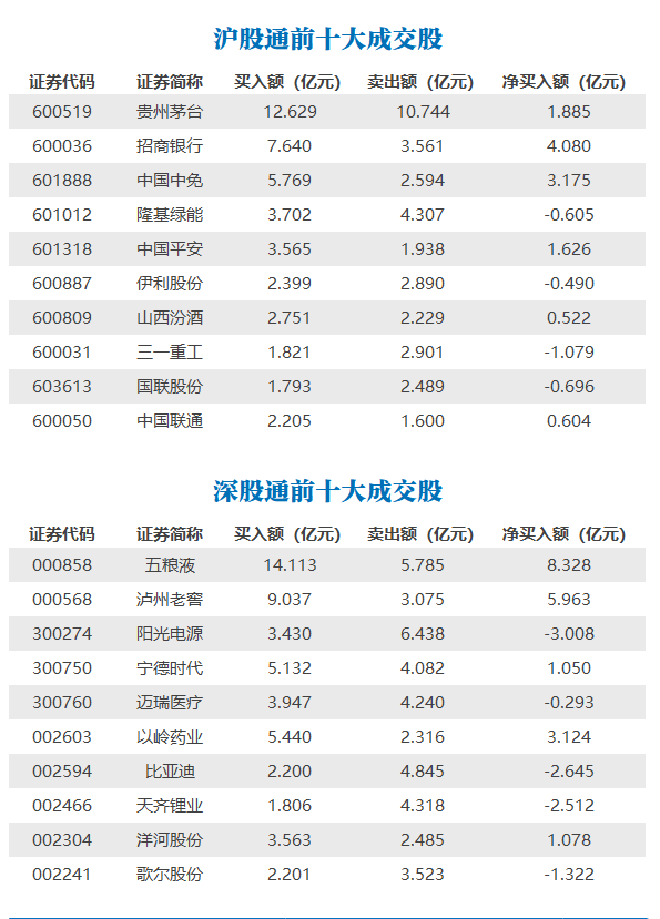 12月20日,北向资金全天净买入11.56亿元,其中,沪股通净买入15.76亿元,深股通净卖出4.2亿元。前十大成交股中,净买入额居前三的是五粮液、泸州老窖、招商银行;净卖出额居前三的是阳光电源、比亚迪、天齐锂业。