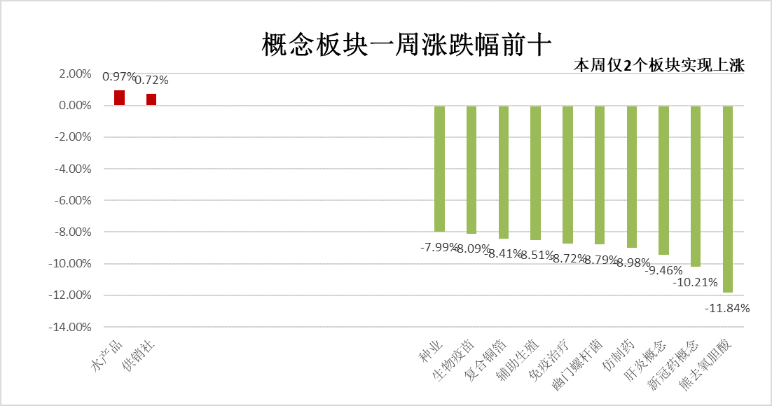 本周猪肉板块下跌1.93%,数据显示,上周生猪价格为20.47元/千克,较此前一周下跌11.84%;猪肉价格为30.22元/千克,较此前一周下跌5.09%。专家认为,当前国内生猪产能处于总体合理区间、不存在产能过剩情况,市场消费偏弱是暂时的,养殖户无需过度担忧。