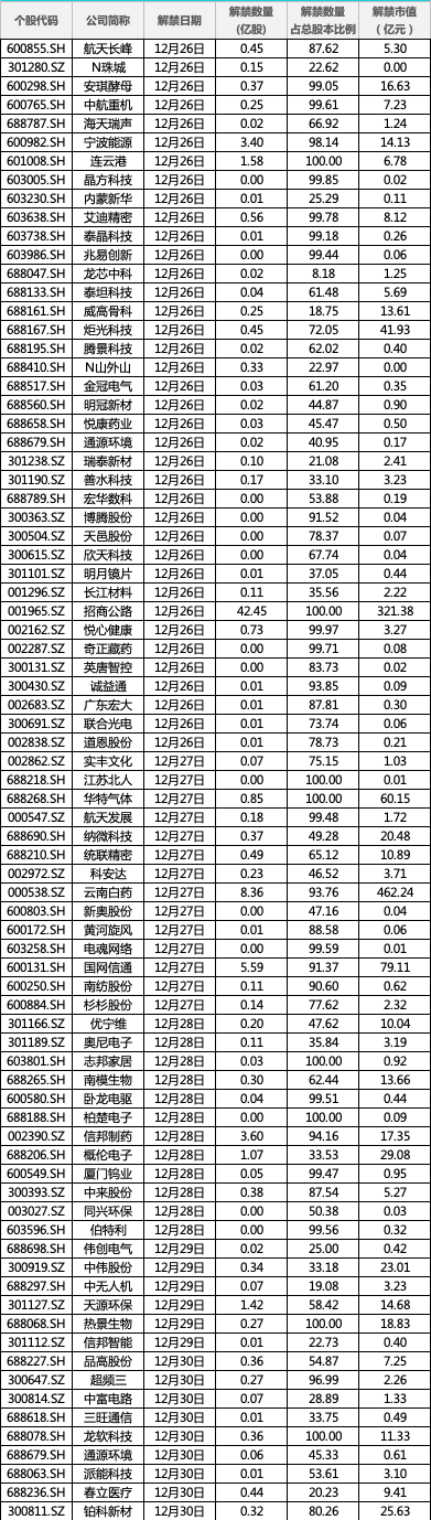 本周将有77.37亿股限售股上市流通,以12月23日收盘价计算,市值约1296.18亿元,均较上周有所增加。个股来看,解禁市值较大的有云南白药、招商公路、国网信通、华特气体、炬光科技、铂科新材等。