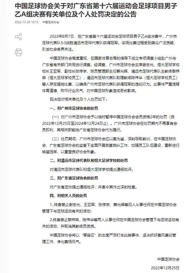 12月25日,中国足协发布关于对广东省第十六届运动会足球项目男子乙A组决赛有关单位及个人处罚决定的公告,对广州市足球协会予以临时暂停中国足球协会会员资格2年的处罚。(中国足协、澎湃新闻)