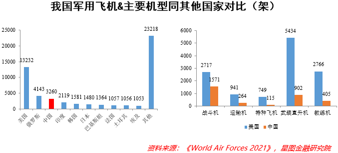 进一步讲,我国军事装备的升级换代亦是推动军工行业发展的重要力量。原因在于,如果横向对比美国等发达国家,我国在一些细分领域的装备实力仍有明显差距。以空军主战装备为例,根据Flight International发布的《World Air Forces 2021》相关数据,目前美军拥有各型现役军用飞机共计13232架,我国军用飞机保有量则为3260架,仅为美军的1/4左右;从细分机种来看,我国战斗机数量约为美军保有量的58%,运输机数量约为美军保有量的28%,而诸如特种飞机、武装直升机、教练机等其他机种,均不足美军保有量的20%。