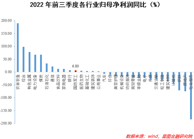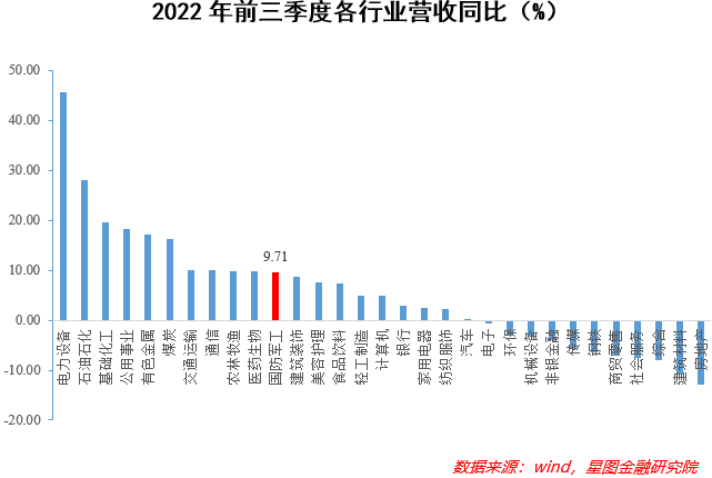 不过从基本面上看,军工行业着实算得上优秀。Wind数据显示,2022年前三个季度,国防军工的营收和归母净利润均实现了正增长,分别为9.71%和6.80%,在申万一级31个行业中均排在第11位,而近期市场大热的房地产、商贸零售等板块的业绩皆不甚理想。考虑到今年以来海内外各种错综复杂的形势及其带来的负面冲击,可以认为军工行业具有较强的经营韧性和抗风险能力。