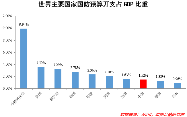 就我国而言,国防预算开支虽然以2077亿美元位居世界第二,但仅占全国GDP的1.5%左右,不仅大幅度低于沙特阿拉伯的9.94%,也低于美国、俄罗斯、韩国、印度、英国等国家,仅排在全球第八名——这与我国经济体量、国土面积以及国防需求显然是不相匹配的。