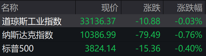 当地时间周二,美股三大指数集体下挫。截至收盘,道指跌0.03%,标普500指数跌0.4%,纳指跌0.76%。