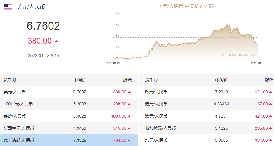 1月18日,人民币兑美元中间价报6.7602,调贬380个基点。前一交易日中间价报6.7222,在岸人民币16:30收盘价报6.7652,夜盘收报6.7689。