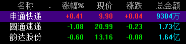 盘面上,截至今日收盘,申通快递涨0.41%,圆通速递、韵达股份均收跌。