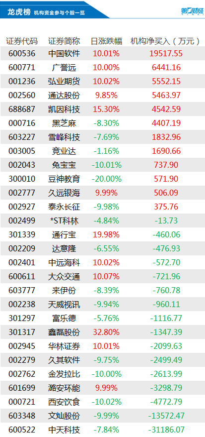 1月19日龙虎榜中,共28只个股出现了机构的身影,有12只股票呈现机构净买入,16只股票呈现机构净卖出。当天机构净买入前三的股票分别是中国软件、广誉远、弘业期货,净买入金额分别是1.95亿元、6441万元、5552万元。当天机构净卖出前三的股票分别是中天科技、文灿股份、西安饮食,净流出金额分别是3.12亿元、1.36亿元、4773万元。