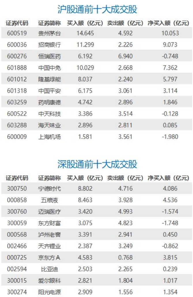 1月19日,统计数据显示,北向资金净买入93.93亿元;其中沪股通净买入56.91亿元,深股通净买入37.03亿元。前十大成交股中,净买入额居前三的是贵州茅台、招商银行、中国中免,分别净买入10.05亿元、9.07亿元、7.36亿元。净卖出额居前三的是上海机场、东方财富、迈瑞医疗,分别获净卖出1.98亿元、1.75亿元、1.57亿元。
