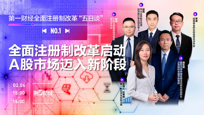 2月6日,第一财经启动全面注册制改革“五日谈”系列线上直播讨论会,首期邀请复旦大学中国金融法治研究院副院长、泛海国际金融学院教授施东辉,招商基金研究部首席经济学家李湛,川财证券首席经济学家陈雳,华兴证券副总经理赵凯,聚焦全面注册制改革启动后A股市场如何迈入新阶段展开讨论。