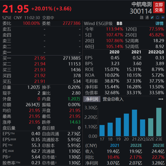2月7日,中航电测再度一字涨停,录得4连板,近4个交易日股价累计涨幅超107%。截至发稿报21.95元,成交额2634万元。