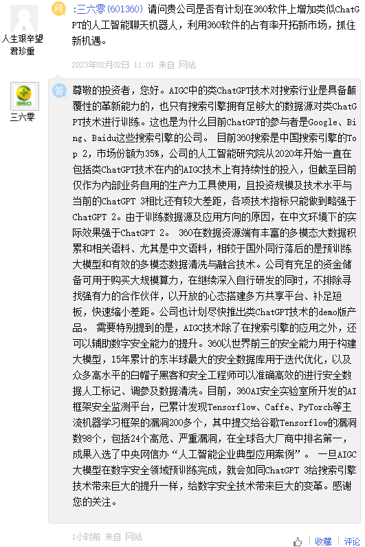 三六零称,公司有充足的资金储备可用于购买大规模算力,在继续深入自行研发的同时,不排除寻找强有力的合作伙伴,以开放的心态搭建多方共享平台、补足短板,快速缩小差距。公司也计划尽快推出类ChatGPT技术的demo版产品。