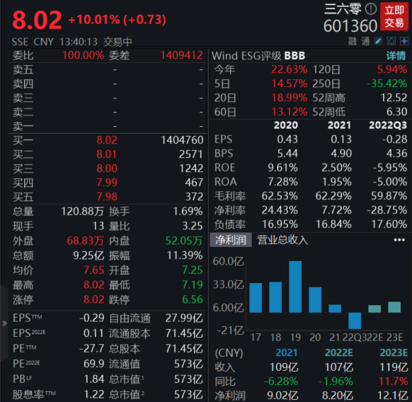2月7日,三六零午后涨停。截至发稿,报8.02元,成交额9.25亿元。