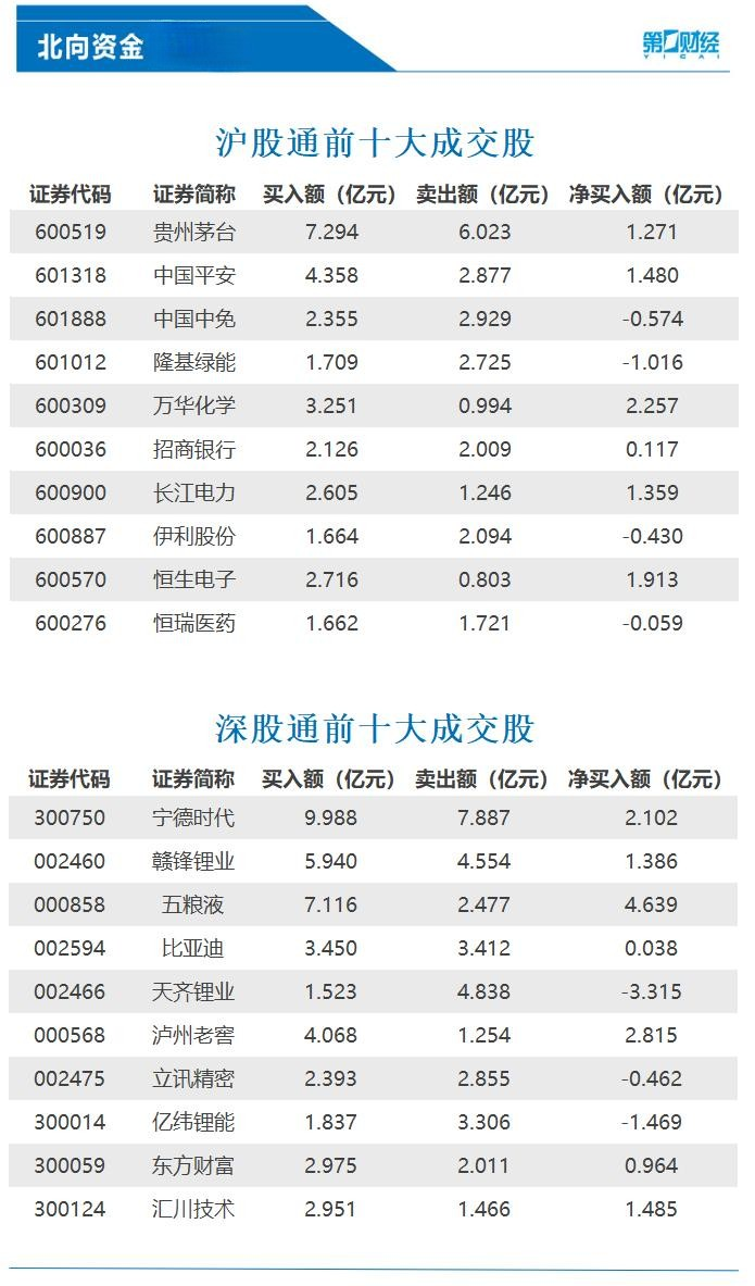 2月8日,北向资金净卖出13.89亿元。其中,沪股通净卖出逾4亿元,深股通净卖出逾9亿元。前十大成交股中,五粮液获净买入4.64亿元。泸州老窖、万华化学分别获净买入2.82亿元、2.26亿元。净卖出额居前三的是天齐锂业、亿纬锂能、隆基绿能,分别遭净卖出3.32亿元、1.47亿元、1.02亿元。