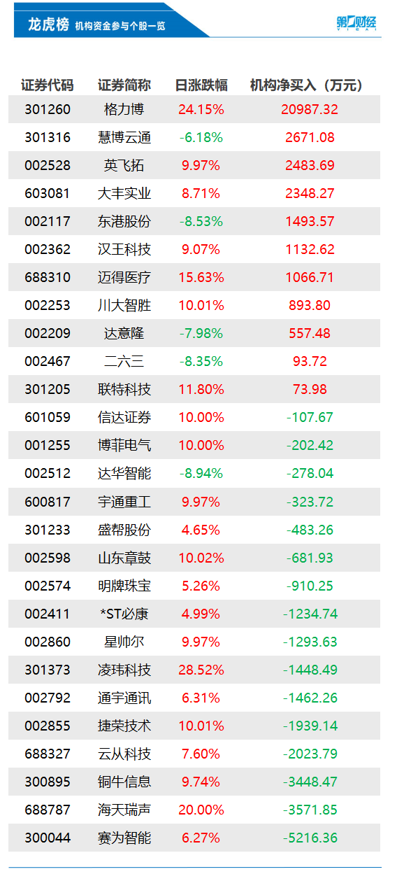 盘后数据显示,2月8日龙虎榜中,共27只个股出现了机构的身影,有11只股票呈现机构净买入,16只股票呈现机构净卖出。当天机构净买入前三的股票分别是格力博、慧博云通、英飞拓;当天机构净卖出前三的股票分别是赛为智能、海天瑞声、铜牛信息。
