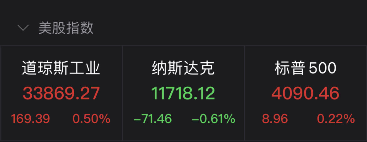 上周五,美股三大指数收盘涨跌不一。道指涨0.5%,标普500指数涨0.22%,纳指跌0.61%。