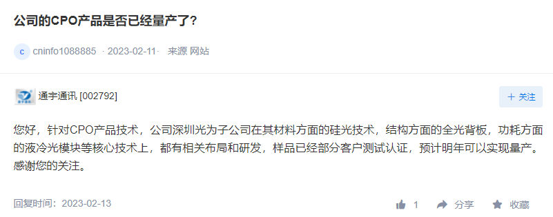 对此,深交所15日对通宇通讯下发关注函,要求说明公司在即将出售深圳光为全部股权的情况下,在互动易作出回复是否真实、准确,是否存在为配合市场炒作故意避重就轻、“蹭热点”的行为。此外,要求公司说明上述研发样品已经取得哪些客户的认证,请提供客户名称、产品名称、认证材料。
