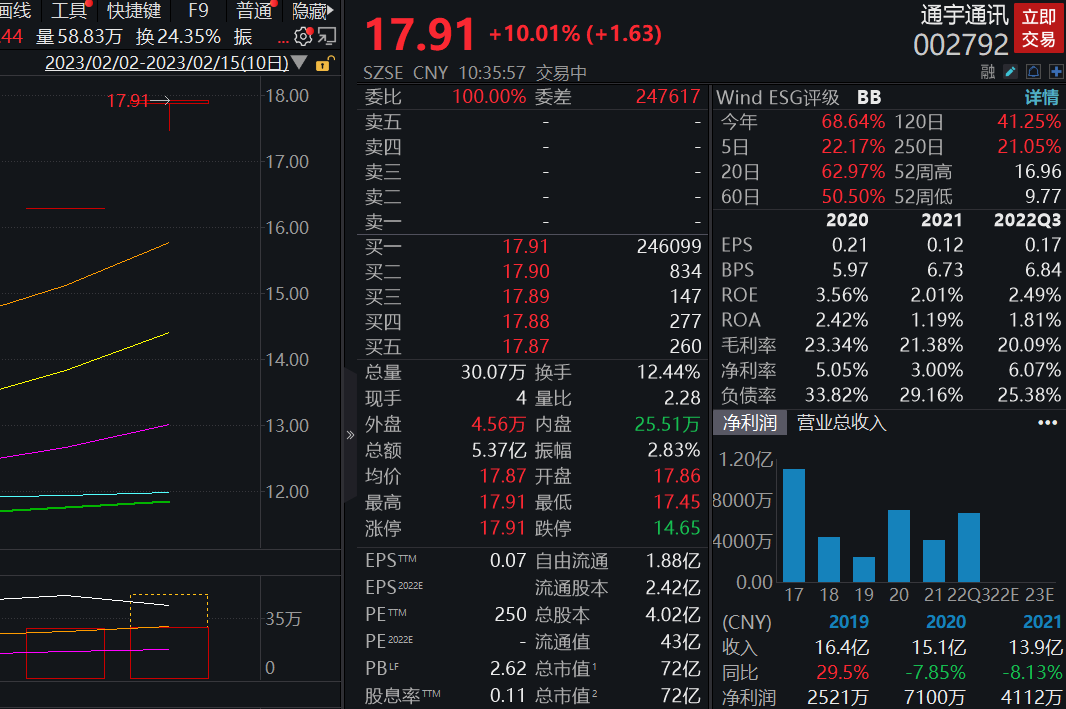2月15日早盘,通宇通讯一字涨停,录得2连板。截至发稿,报17.91元,成交额5.3亿元。