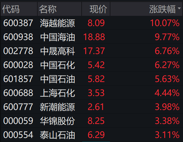 3月7日,石油板块走强。截至发稿,中国石化涨超6%,股价创4年多以来新高;中国海油一度触及涨停,股价创上市以来新高,现涨超9%;中国石油涨超5%。海越能源、新潮能源、泰山石油等股纷纷走强。
