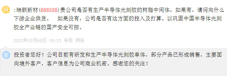 近日,有投资者提问是否有生产半导体光刻胶的树脂中间体,对此,瑞联新材3月8日晚间在互动平台表示,公司目前有研发和生产半导体光刻胶单体,部分产品已形成销售,主要面向境外客户,客户信息为公司商业机密。