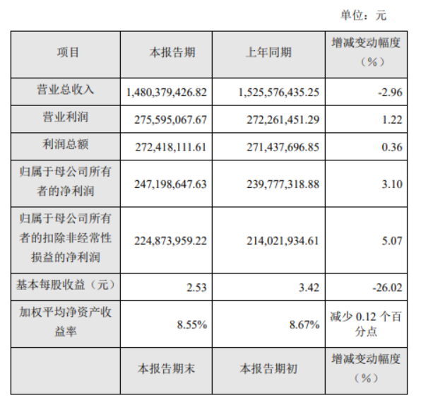 报告期末,公司总资产336,373.93万元,较期初下降12.19%;归属于母公司的所有者权益295,729.39万元,较期初增长3.60%;归属于母公司所有者的每股净资产30.05元,较期初下降26.11%。
