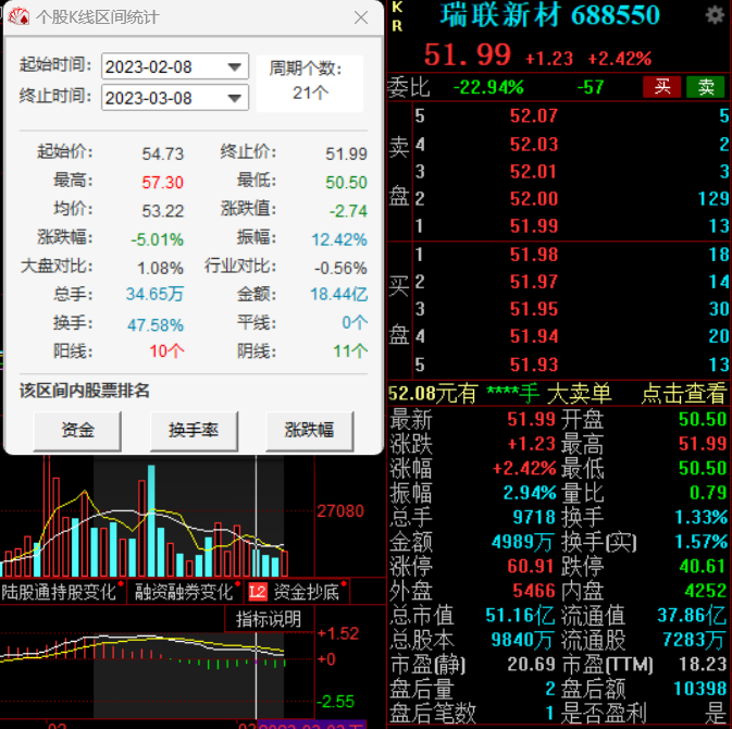二级市场上,近一个月以来,瑞联新材股价震荡下行,累计跌5.01%。