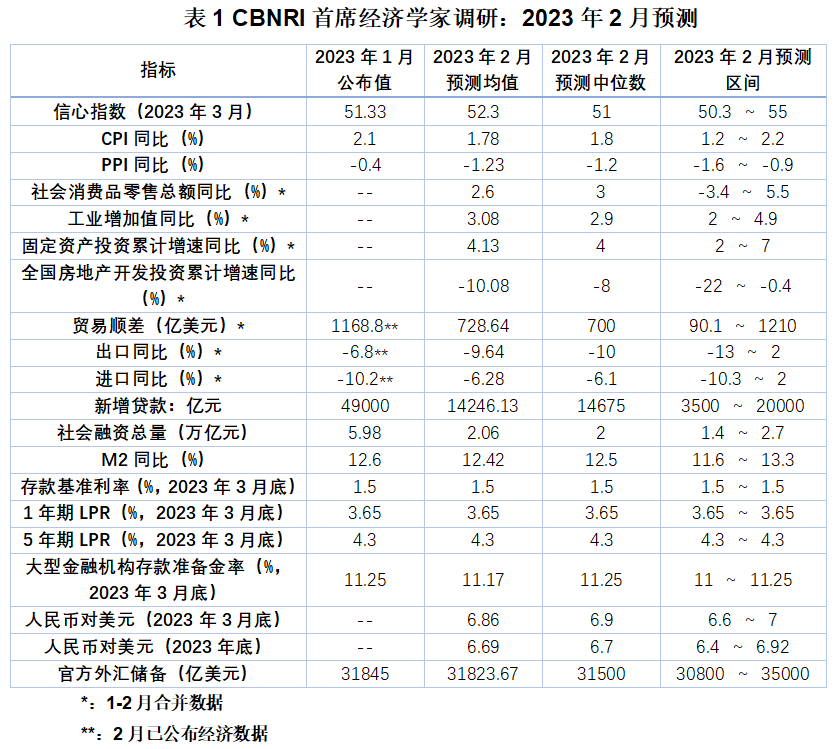 本期调研中,首席经济学家们对2023年1月CPI同比预测均值为1.78%,PPI同比预测均值为-1.23%。他们对1-2月固定资产投资同比增速的预测均值为4.13%,1-2月社会消费品零售总额同比增速的预测均值为2.6%。海关总署公布的数据显示,今年前2个月我国贸易顺差1168.8亿美元,同比增长6.8%,超出经济学家们的预期。