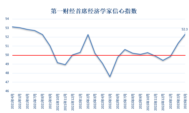 2023年3月,第一财经研究院发布的“第一财经首席经济学家信心指数”为52.3,连续3个月上升,为近20个月以来的最高值。