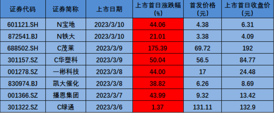 具体来看这8只新股所属上市板块,沪市2家、深市4家、北交所2家,分别是:绿通科技、播恩集团(001366.SZ)、凯大催化(830974.BJ)、一彬科技(001278.SZ)、茂莱光学、华塑科技(301157.SZ)、宝地矿业(601121.SH)、铁大科技(872541.BJ),8只股上市首日平均收涨52.33%,分化也较为显著。