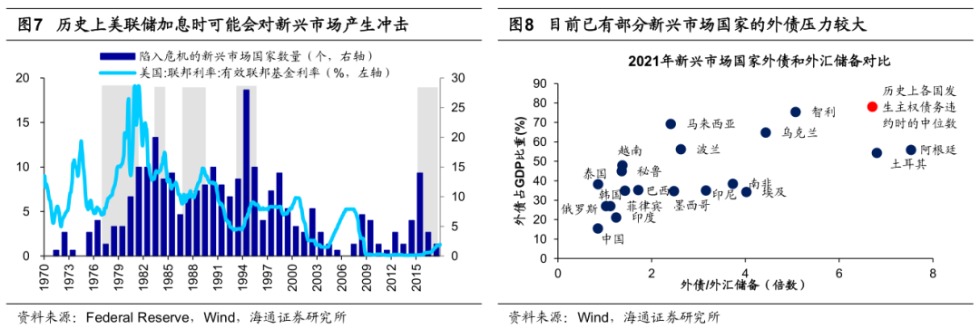在美联储加息的推动下,部分新兴市场国家主权债务风险增加。随着美元借贷成本持续提升,新兴市场国家债务违约风险同样值得警惕,2022年斯里兰卡自1948年脱离英国独立以来首次出现主权债务违约。此外,根据IMF统计,目前新兴市场有约2370亿美元的外债面临违约风险,25%的新兴市场国家接近债务困境。2023年,南美国家阿根廷、贸易赤字严重超标的土耳其等违约风险相对较高。往后看,在本轮美联储的紧缩周期中,新兴市场的主权债务风险存在愈演愈烈的可能。理论上,在美联储开启紧缩周期后,随着对外借贷利率上升、美元升值而本币贬值,新兴市场国家的外债负担将持续加重;同时,随着美联储政策持续收紧,原本吸纳了较多国际资本的新兴市场国家也将遭遇明显的资本外流。因此,外汇储备和外债此消彼长之下,部分低收入新兴市场国家陷入债务困境的概率将大幅增加,且在极端情况下可能进一步演变为金融危机,例如1980年代初的拉美债务危机、1990年代中期的亚洲金融危机等。