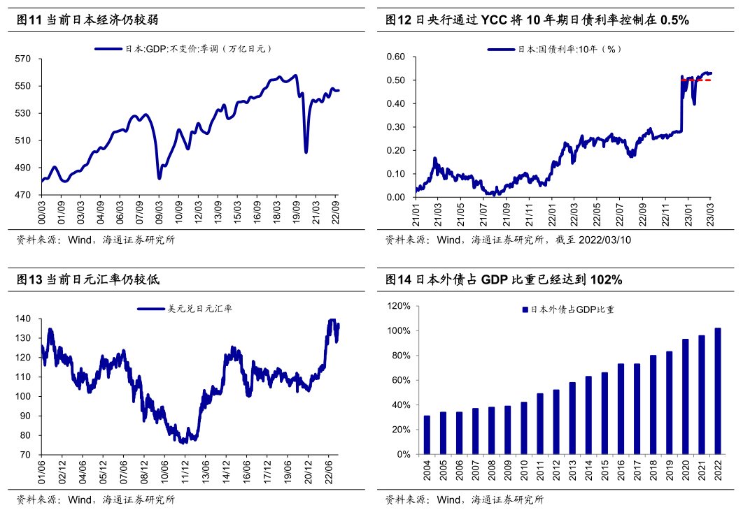 日央行为助力经济复苏逆势选择政策宽松,日元和日债的风险正在积累。由于当下日本的经济基本面依旧羸弱,从GDP总量来看2022年日本经济仍未恢复到疫情前水平,因此在当前全球各大央行的加息潮下,日本央行却逆势选择宽松的政策。目前日央行主要通过国债收益率曲线控制政策(YCC)来达到宽松的目的,即通过无限量购债的方式将10年期日债收益率控制在0%附近(当前容忍利率波动的上下限为0.5%)。