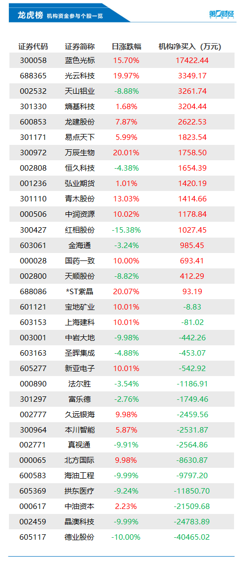当天机构净买入前三的股票分别是蓝色光标、光云科技、天山铝业,净买入金额分别是1.74亿元、3349万元、3262万元。