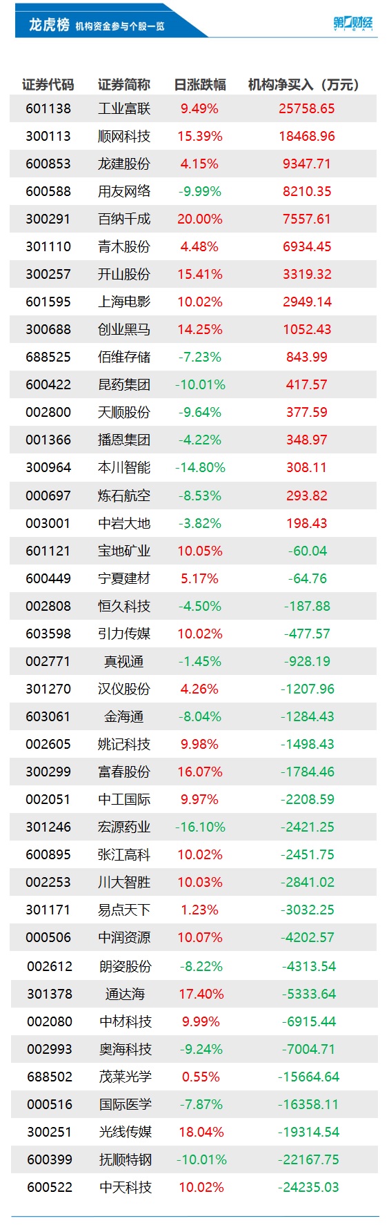 当天机构净买入前三的股票分别是工业富联、顺网科技、龙建股份,净买入金额分别是2.58亿元、1.85亿元、9348万元。