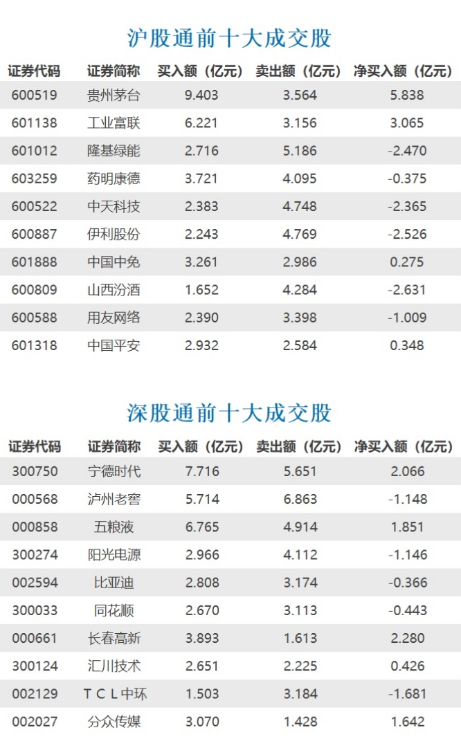 3月21日,北向资金净买入42.95亿元。其中,沪股通净买入24.80亿元,深股通净买入18.15亿元。前十大成交股中,净买入额居前三的是贵州茅台、工业富联、长春高新,分别获净买入5.84亿元、3.07亿元、2.28亿元。净卖出额居前三的是山西汾酒、伊利股份、隆基绿能,分别遭净卖出2.63亿元、2.53亿元、2.47亿元。