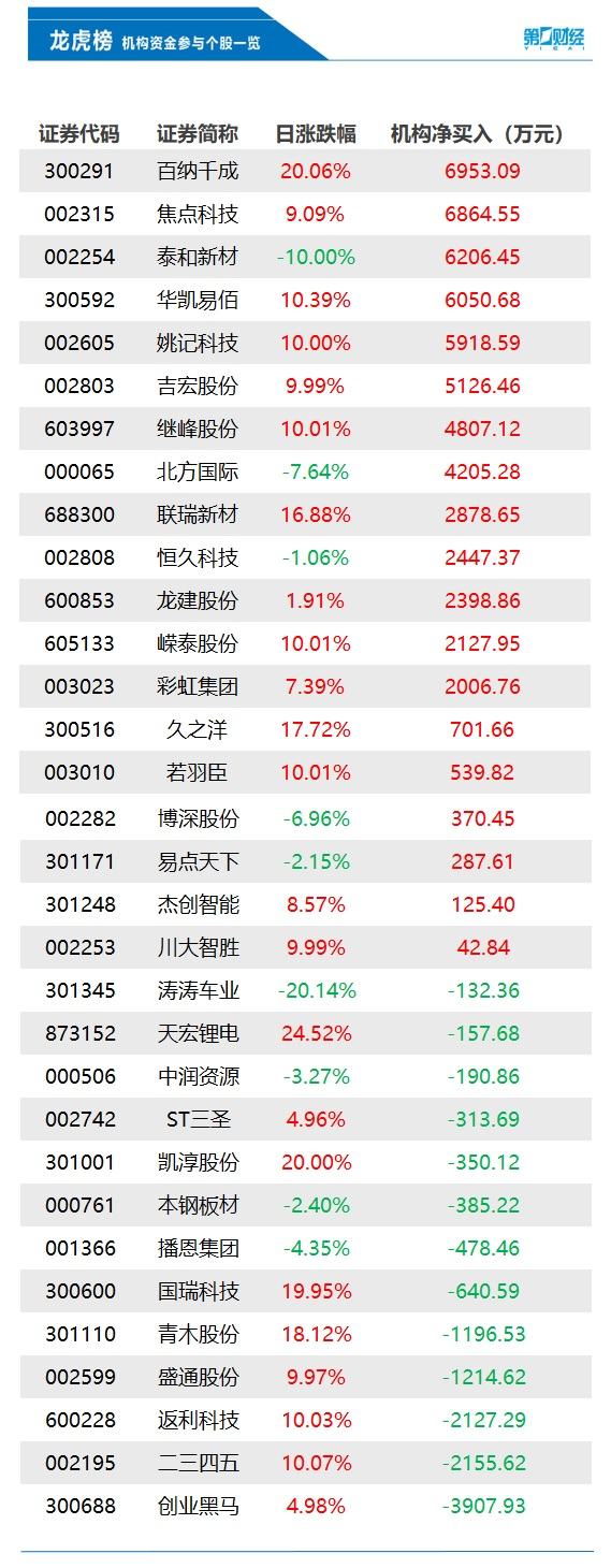 3月21日龙虎榜中,共32只个股出现了机构的身影,有19只股票呈现机构净买入,13只股票呈现机构净卖出。当天机构净买入前三的股票分别是百纳千成、焦点科技、泰和新材,净买入金额分别是6953万元、6865万元、6206万元。当天机构净卖出前三的股票分别是创业黑马、二三四五、返利科技,净流出金额分别是3908万元、2156万元、2127万元。