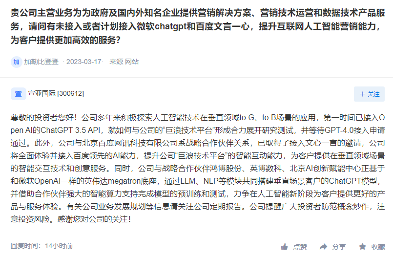 宣亚国际3月21日在互动平台表示,公司与战略合作伙伴鸿博股份、英博数科、北京AI创新赋能中心正基于和微软OpenAI一样的英伟达megatron底座,通过LLM、NLP等模块共同搭建垂直场景客户的ChatGPT模型,并借助合作伙伴强大的智能算力支持完成模型的预训练和测试。