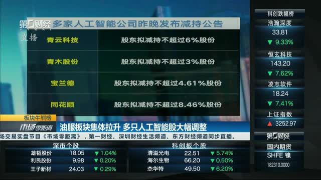 油服板块开盘拉升,恒泰艾普、卓然股份大涨,博汇股份、中油工程、通源石油、潜能恒信等纷纷走强。人工智能板块多股大幅低开,青云科技、宝兰德、同花顺、格灵深瞳、炬光科技走弱。消息面上,多家人工智能公司昨晚发布减持公告。