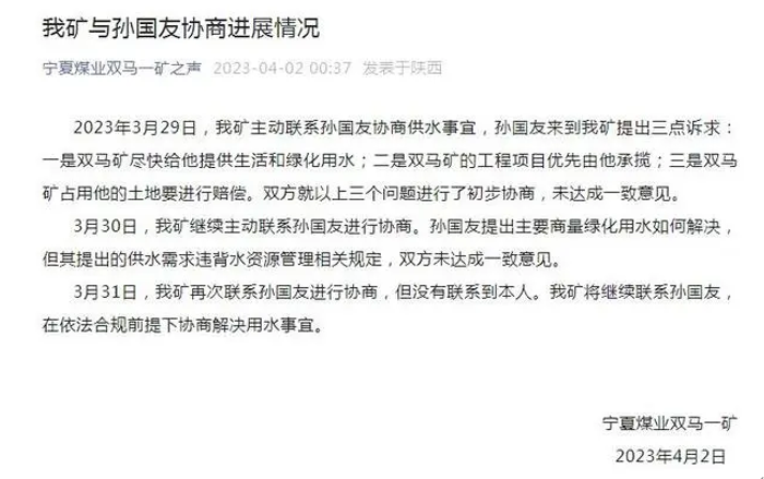 4月2日,宁夏煤业双马一矿发布声明称,3月31日再次联系孙国友协商,但没有联系到本人,将继续联系孙国友,在依法合规前提下协商解决用水事宜。(环球网)