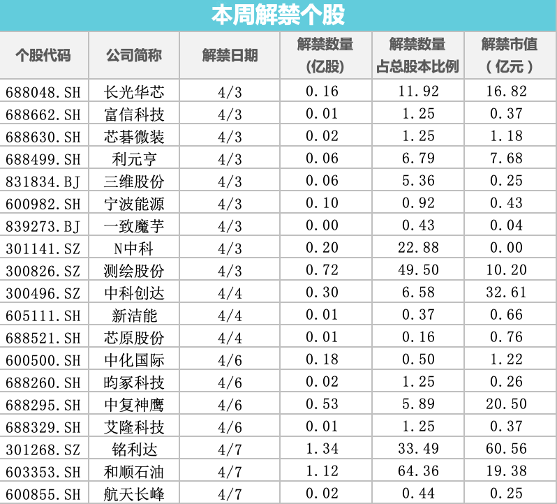 从解禁市值来看,4月7日是解禁高峰期,3家公司解禁市值合计80.19亿元,占本周解禁规模的46.41%。按3月31日收盘价计算,解禁市值居前三位的是:铭利达、中科创达、中复神鹰。从个股的解禁量看,解禁股数居前三位的是:铭利达、和顺石油、测绘股份。