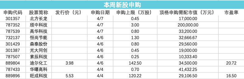 本周,A股将有10只新股发行,其中北交所有2只,4只科创板。其中,4月4日发行的是华曙高科、旺成科技;4月6日发行的是光大同创、索辰科技、恒尚节能、森泰股份、迪尔化工;4月7日发行的是北方长龙、高华科技、颀中科技。
